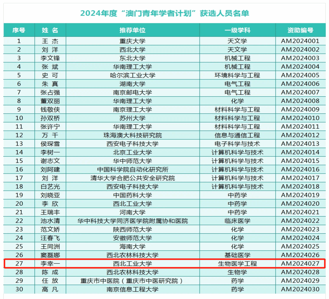 9月初,全国博士后管委会办公室公布了2024年度“澳门青年学者计划”获选结果名单。本年度,“澳门青年学者计划”在内地高校共计资助30人,西北工业大学有2人入选,计算机学院李幸一老师为其中之一。