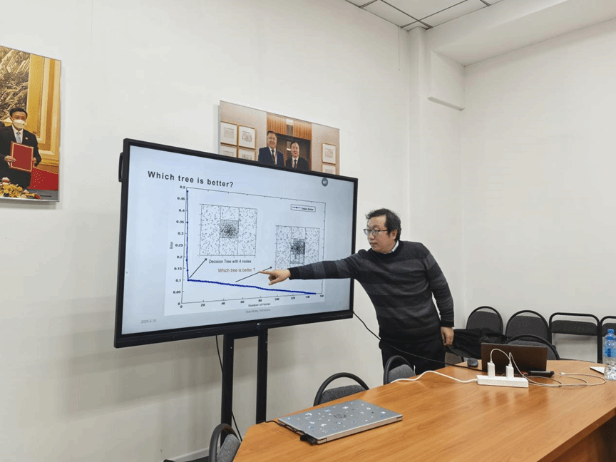 元宵节前,2月9日,计算机学院张晓教授便率先踏上了前往阿拉木图的旅程,面对面开展专业课Data Mining Techniques的讲授。授课之余,张晓以饱满的热情和专业的态度,向同学们介绍了计算机学院的发展历程,详细阐述了学院的学科分布情况,让同学们清晰地了解到计算机学院丰富多样的学科体系及学院国际化进程,也对学院有了更深刻的认识。在授课过程中,张教授凭借其丰富的教学经验为学生们进行了课程讲解,并积极与学生们展开互动,鼓励学生们积极探索计算机科学的广阔前景,激发他们对这一领域的兴趣和热情,为他们后续来华学习做好充分的准备。