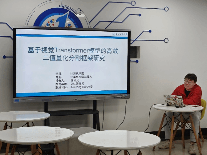 2025年5月8日晚,第十四期国际化交流活动在二楼转角会议室拉开帷幕。活动邀请到学院20级博士研究生谢耶凡(导师郑江滨教授,海外导师为Jinchang Ren教授),围绕“基于参数量化视觉 Transformer(ViT)的赤潮分割技术研究”展开分享。在计算机视觉领域,视觉 Transformer(ViT)虽逐步成为主流,但模型规模扩大带来的高计算成本限制了其在实时场景的应用。针对海洋环境监测中赤潮快速识别需求,谢耶凡介绍了一种高效二值量化分割框架,通过创新的 1-bit 量化方案与细粒度特征补偿机制,大幅降低模型计算复杂度,实现对赤潮区域高效精准检测,该技术在海洋环境保护、渔业资源管理和生态灾害预警等领域极具应用价值。