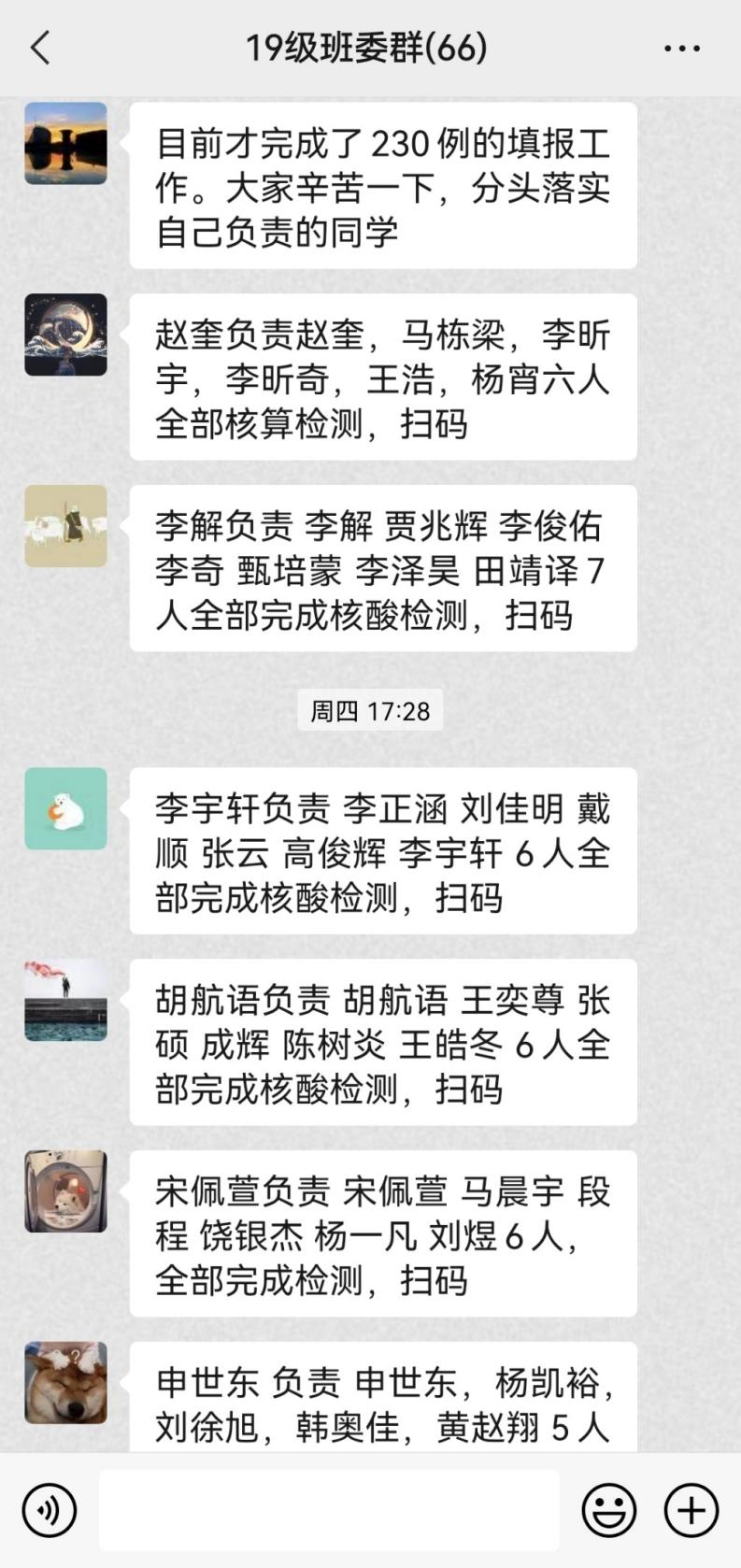 为了高效地开展疫情防控工作,辅导员梁韵基老师组织19级全体班委进行思想动员和工作部署,强调全体同学要有大局意识和集体意识,在关键时期,要充分体现学生干部的责任担当和奉献精神。同时,年级提出了人对人、点对点的精准疫情监控政策。全年级60余名班委,每人负责五名左右同学,实行精细化、全覆盖的疫情监测方式,保证全年级同学能够及时、严格地按照学校的要求进行核酸检测和疫情填报。在保障疫情防控的前提下,也关注同学们的心理健康,及时疏导同学的紧张情绪,并积极帮助那些心理有困难和生活有困难的同学。年级力求在全力配合好学校的疫情防控部署的情况下,确保每一位同学的身心健康,维护正常的在校学习生活秩序。