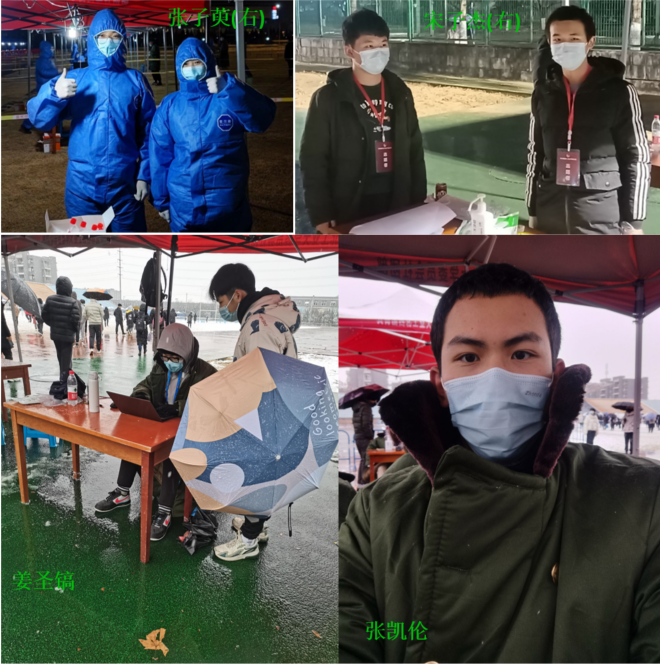 为了保障全校师生的安全与健康,学校组织了多轮次的免费核酸检测工作。由于核酸检测工作时间紧、任务重,核酸检测保障人员面临严重的紧缺。在张营老师的呼吁下,计算机学院本科2020级多名学生挺身而出,担任了核酸检测工作志愿者,负责核酸检测师生健康码、身份证、一卡通的核对以及后台数据的处理等工作。尽管天气寒冷,防护服的束缚与长时间站立让志愿者们有些疲惫,但志愿者们毫无怨言。计算机学院本科2020级的志愿者们连续5个多小时的室外工作,手脚冻的麻木,但依旧没有影响他们的工作热情,他们坚信此刻的疲惫与困倦,都是对最终抗疫成功的蓄力!在此轮来势汹汹的疫情面前,计算机学院本科2020级的志愿者们用无私的奉献践行了西工大“公诚勇毅”的校训,用实际行动响亮喊出“请党放心,强国有我”的口号,展现了西工大人应有的精神风貌。