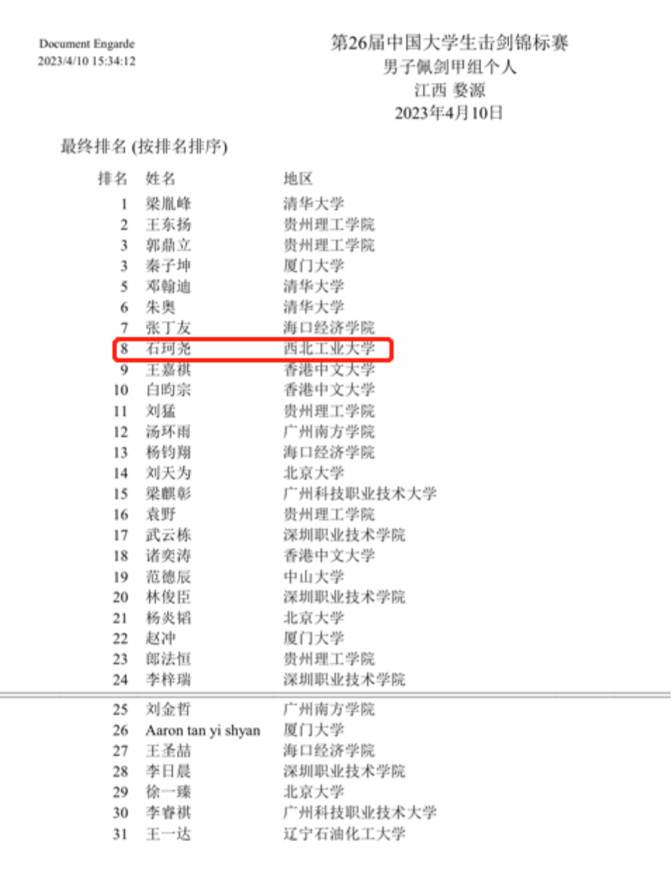 此次比赛共有51所高校650余名运动员参加,是历届比赛中规模最大、水平最高的一次比赛。计算机学院的石珂尧同学代表学校参加了男子佩剑甲组的比赛,最终取得了学校男子佩剑历史最好成绩,全国赛第八名!