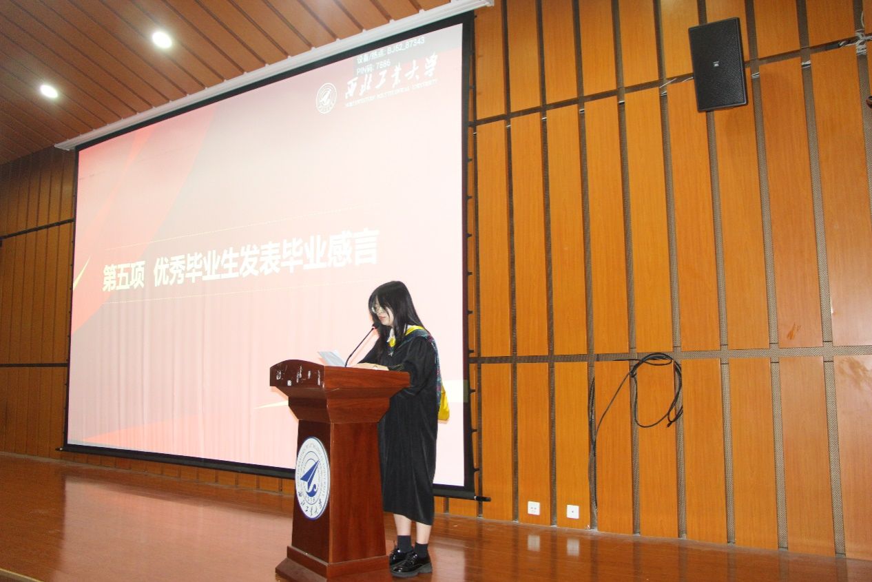 独唱《人世间》,表达对父母的感恩、对毕业的不舍、对人生路的思考。合唱西北工业大学校歌,表达对母校的不舍与难忘,表达作为西工大学子将计算报国、强国有我的使命和信念牢记于心、外化于行。