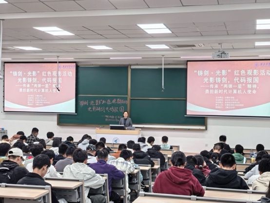 2025级本科组织“铸剑・光影”红色观影活动,学生们在教学西楼D201教室集中观看影片《横空出世》。观影前,辅导员韩淑捷老师介绍了西北工业大学与国家重大科技工程的深厚渊源及“为国铸剑”的校史传统。结束后,两名新生代表结合专业发言,表达了传承“两弹一星”精神、激扬“代码报国”志向的坚定决心。