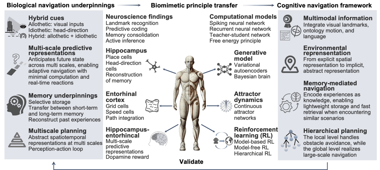 自Edward C. Tolman于1948年首次在小鼠实验中提出“认知地图”概念以来,神经科学领域历经数十年探索,逐步揭示了大脑空间导航的底层机制。研究人员在多种生物的海马体—内嗅皮层系统中不断发现与认知地图相关的神经表征,这一方向的突破性进展促成了2014年诺贝尔生理学奖授予支撑空间定位与导航能力的神经细胞的研究。这些成果为理解认知功能如何在大脑中被表征、复杂行为如何被计算与组织奠定了重要基础。尽管神经科学领域的空间导航研究取得了显著进展,但长期以来,神经科学与具身导航研究处于相对割裂的状态。自然界中的生物依赖内在的认知地图,能够在陌生环境中以极低能耗实现长时间稳定导航;相比之下,现有具身智能体在泛化能力、能效和持续任务执行方面仍存在明显差距,难以持续适应未知环境。针对这一瓶颈,该研究从跨物种神经科学中汲取灵感,系统提炼出多模态感知融合、预测性表征、记忆驱动决策与分层规划等关键认知机制,并以“认知地图”为核心,构建了一套统一的空间理解与决策框架,旨在弥合神经科学理论与具身导航实践之间的鸿沟。该框架强调基于多尺度预测的空间表征,不同于依赖精确坐标的传统方法,更注重以地标和语义关系构建空间表示。通过感知、记忆、推理与行动四者的协同,系统能够实现对未知环境的快速适应与高效导航。进一步地,研究提出将这些能力进行有机整合,并根据环境与任务需求动态调配,从而构建出兼具泛化能力与能效优势的机器人导航架构。